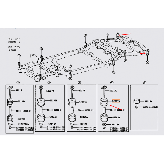 Подушка рами кузова Toyota 52207-35050 — оригінальна деталь кріплення кузова до рами Toyota / Lexus, яка застосовується на Prado 120, GX470, 4Runner і FJ Cruiser.